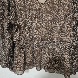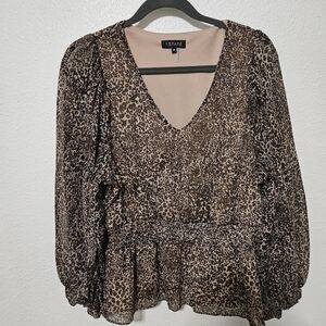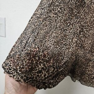1 State cheetah print sinched Balloon sleeve sheer top size medium see pics for verification of size used no holes or stains measurements approximately flat lay pit to pit 18 length 24 1/2 sleeve 22