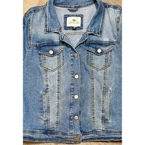 This 1 Sunset Lane denim jacket features a unique hand-painted botanical leaf design on the back and sleeves. Classic button-up jean coat with front pockets, side pockets, relaxed fit, and artistic flair. Perfect statement piece for layering.