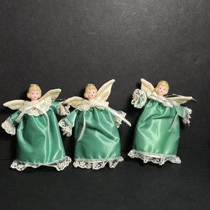 1 Angel ornament that measures approx. 5.75". She is wearing a dress/robe that is a light green color that is accented with lace trim. She has a Victorian vibe. Her underskirt/frame is cardboard and her head and arms are porcelain. She has a loop for hanging, but you could also use her in a display or as a tree topper for a miniature tree. This is preowned and is in great condition. If interested I have other fabric ornaments that coordinate with her as shown in the last picture, that are available in other listings. Please zoom in on photos for detail as pictures are part of the description. If you have any questions, please contact me before purchasing. We have a smoke free environment