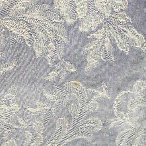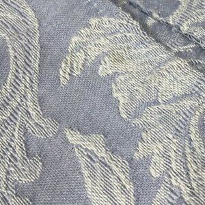 A single light-blue curtain with white embroidery throughout the surface. A product of Burlington, circa the 1990s. Tab top heading. Unlined and lightweight.