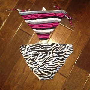 Top is black and padded with adjustable straps. 2 bottoms: 1 is black and white zebra without adjustable sides; 1 is pink, black, white, and grey striped with adjustable straps. All size L. See pics for more details. Bundle all 3 items for $15, or buy individually for $6 each.
