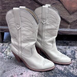 Classic Frye boots with a rugged leather finish. Ideal for versatile wear.