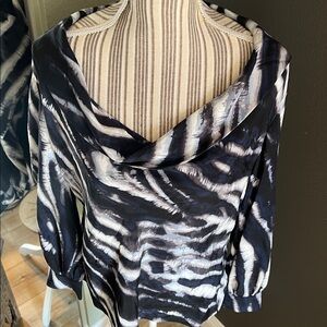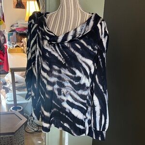 Elegant blouse with a striking navy and white pattern. Features a stylish draped neckline.