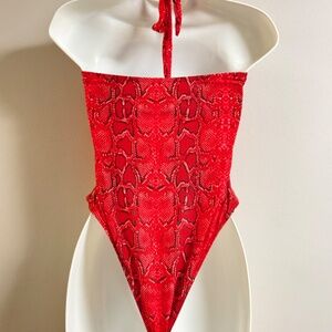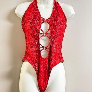 Women's Snakeskin Print Plunge Neck Cut Out Backless Halter One Piece SwimsuitBurgundy - Size: Medium