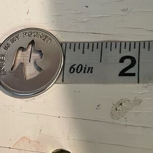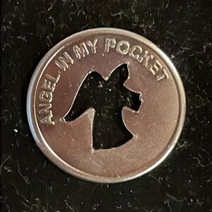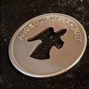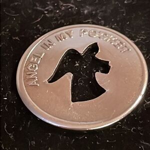 1” silver tone round coin w/Angel shape cut out “Angel in my pocket”