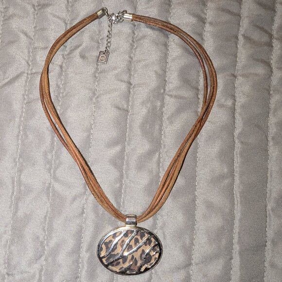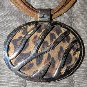 $1 with Bundle ~ Leather Cord Necklace with Leopard Print Oval Pendant 5441 A
