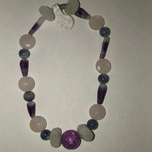 10 3/4" long twist closure anklet. This anklet has a crackled glass purple focal bead, rainbow moonstone, rose quartz, denim lapis, and chevron amethyst. This is a handmade anklet.