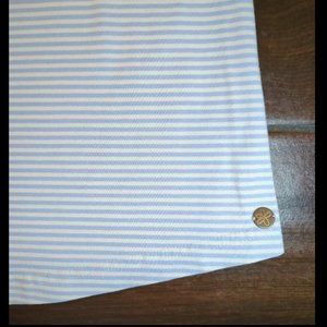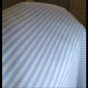10 435 Matilda Jane Sharing Secrets Top Shirt Tank featuring a light blue and white stripe background with mustard/yellow sleeves with white flowers, purple/lilac flowers top, and pink keyhole with button.