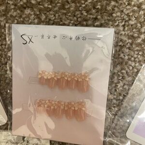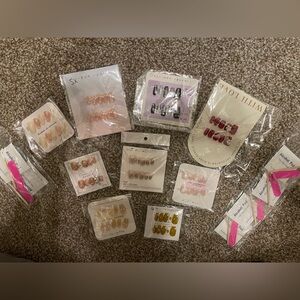 Stylish press-on nails. 10 pairs of super cute nails, application sets, cuticle oil. Most of these nails have 3-D art. They are good quality, Size XS. Perfect for a chic look.