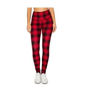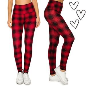 *Red Plaid Print High Waist Leggings With 5" Yoga Style Waistband.