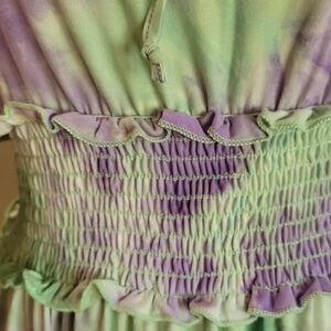 Im loving this green and purple tie dye frilly dress. It's hits just above the knee and has a cute ruffle hem with frill trim.