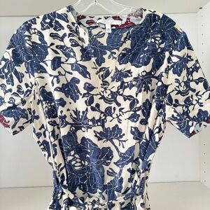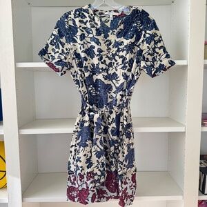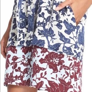 Contrasting floral patterns enhance the layered-look construction and easy bohemian vibe of this short-sleeve silk cinched with a waist-defining tie belt. Slips on over head. V-neck, short sleeves, side-seam pockets, 100% silk. Size 2