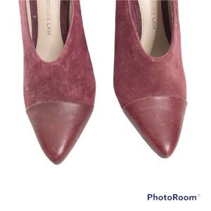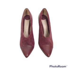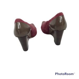 10 Crosby Derek Lam red suede and leather wedges. Red suede body with leather toe caps and wedge heel. Red toe caps and brown wedge back.