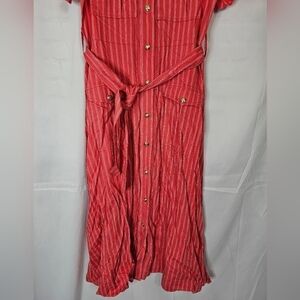 NWOT 10 Crosby Derek Lam size 4 striped button down midi dress in light red and white linen with vertical white stripes. Red linen utility midi dress with gold hardware button down. Mock neckline, shoulder epilets, 2 breast pockets with gold logo hardware. Flutter short sleeves. Fitted A-line silhouette. Removable belt at waist. 2 front hip pockets with hardware. Sample piece from Summer 2020.