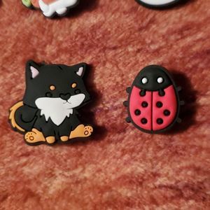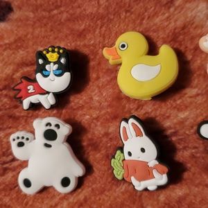 10 different crocs charms or Jibbits/Jibbitz. There's a bunch of cute animals, including a dog in a cape, duck, Llama, bunny rabbit screaming(!), polar bear, bunny rabbit with carrots, cow, sloth, wolf/fox/brown husky puppy & ladybug.