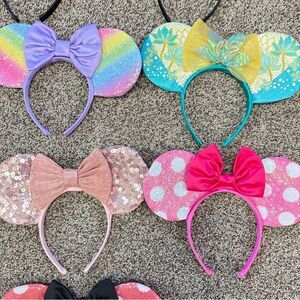 A vibrant collection of mouse ear headbands. Features a variety of colors including red, pink, purple, and more. Perfect for adding a playful touch to any outfit.