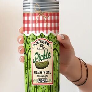 Dill Pickle tumbler with a fun pickle design and red checkered accents. Straw and top.