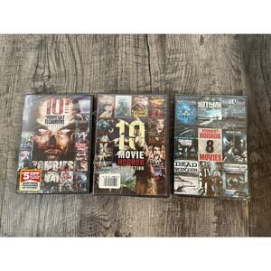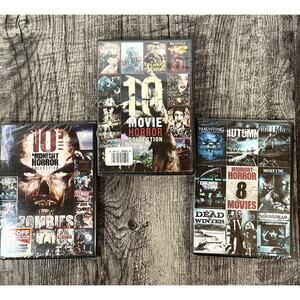 Lot of three horror movie dvd sets. Over 28 movies included. Not sure if there are duplicates. Please refer to pictures to see which movies are included. Brand new. All three sets are sealed but there is some ripped areas in the plastic. Please refer to pictures and feel free to contact me with any questions.