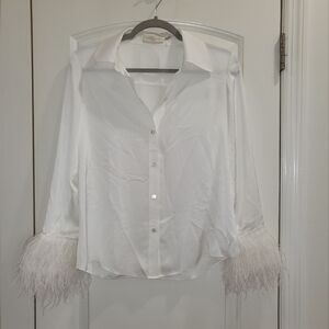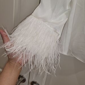 Point collar. Button front closures. Long sleeves with feather trim cuffs. Unlined. Body: polyester; trim: dyed ostrich feathers. Dry clean. Color: white