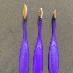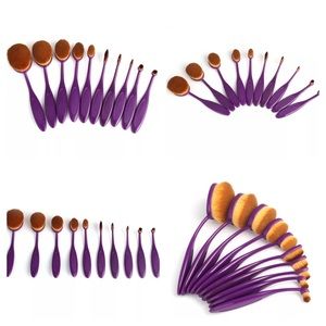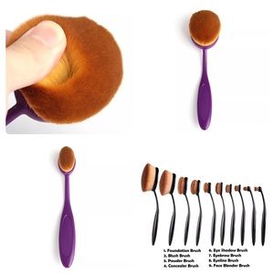 The latest in make up brushes is the new oval/toothbrush makeup brush. This set of ten, in your color choice of pink or purple, come with the following brushes: Foundation; Blush; Powder; Concealer; Contour, Eyeshadow; Eyebrow; Eyeliner; Face Blender; and Eyeshadow Blender. There are five oval face brushes, three slender eye / lip brushes, and two round eye / lip brushes.
