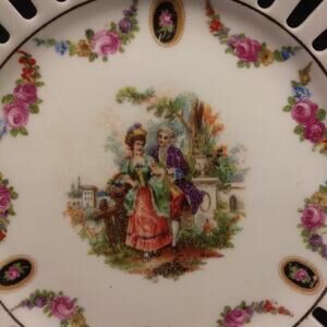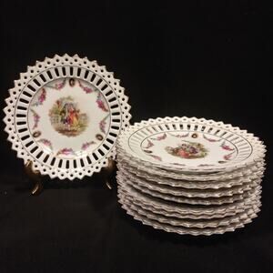Pierced white porcelain tea plates with painted intricate scenes surrounded by lattice lace edging. Beautifully hand painted with vignettes of various courting couples with gold trim accents.