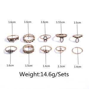 Silver plated set of 10 rings. Please note that these are various sizes and are meant to be worn on your fingertips above the knuckle, as a group like the sample photo illustrates. They will not fit like regular rings. I would advise against purchasing if you have large fingers because not all of them will fit.