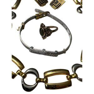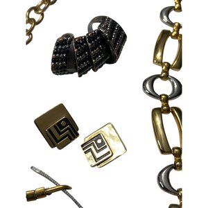 A curated collection featuring vintage Monet necklace, Laurel Burch earrings, chain belt, and assorted rings. Ideal for collectors or unique accessory lovers. Some vintage. Goth, Boho