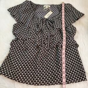 So cute! New with Tags, Max Studio Small Black and White Polka Dot Print Short Sleeve Blouse With Ruffle Detail and Tie neck Closure. 96% Polyester and 4% Spandex. See pictures for details and measurements. MSRP $78