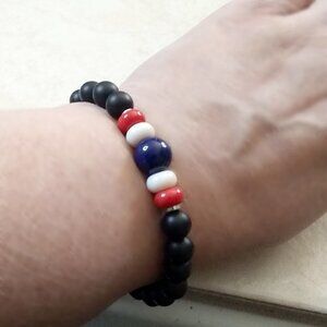 Sooo - I am sure there is someone who can find a suitable use for this elastic bracelet. Made with black stone beads, a blue Lapis bead, and red + white ceramic donut beads. It's been made to comfortably fit a 6.5-7" wrist - but I should have enough of these colors left, to create one for you in the size you need. Simply use the custom option to purchase and send me a message with the wrist size you need! Just ask!