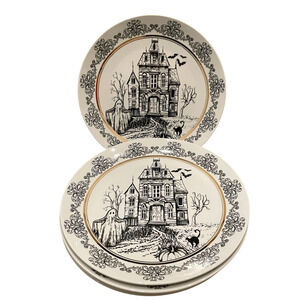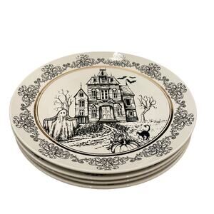 10 Strawberry HALLOWEEN HAUNTED HOUSE Ceramic Dinner Plates 10.5in Set 2