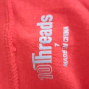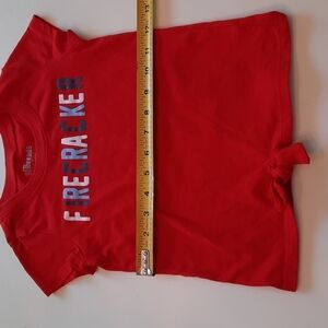 10 Threads size 7 firecracker patriotic short sleeve tshirt. Very good pre-owned condition. Smoke free pet friendly home. Please see pictures for measurements. Ties at front bottom in middle. Tshirt short sleeve patriotic Fourth of July firecracker size 7 10 Threads