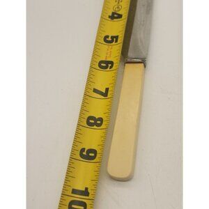 Add a touch of vintage charm to your cutlery collection with these 10 Sheffield butter knives. The yellow bakelite handles and bone handle material add a unique pop of color to your table setting. The universal type and single flatware piece category make them versatile for any occasion. These knives have been previously loved, adding character and history to your collection. Bring home a piece of England with these vintage treasures.