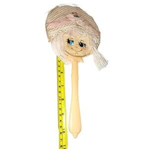 This is an adorable vintage child's hand-held mirror featuring a sweet doll face design. Measuring 10 inches, it's the perfect size for little hands. This mini mirror would make a delightful addition to any vintage collection or a charming gift for a doll enthusiast.