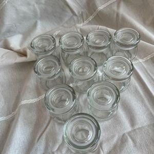 Set of 10 brand new 2 ounce jar with a flat glass lid. Food and dishwasher safe. Great for party favors, gifting, crafts, storage. So cute! Perfect size.