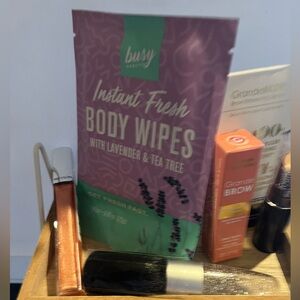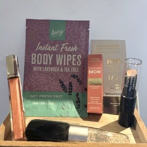 10 item beauty bundle lipstick body wipes brow serum Versace bath shower gel etc
