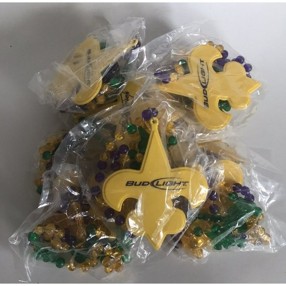 Lot of 10 new in package liquor beer promo Mardi Gras style beads. Purple, green and yellow beads with a yellow “Bud Light” fleur de lis. Multiple lots available as well as other styles.