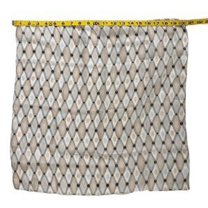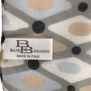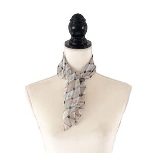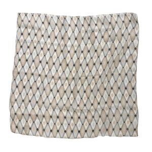 Description: Diamond patterned scarf in white, gray, pale purple, black & tan by Barr & Beards. Can be worn around the neck or tied to your hand bag. Made in Italy. Comes from a smoke free home.