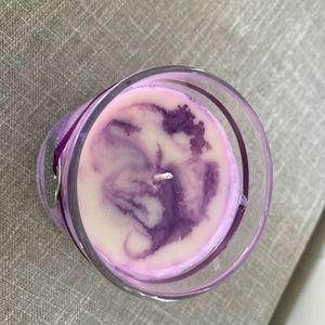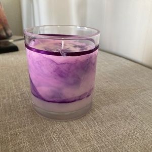 This candle is a purple marble candle with an orange citrus scent. It is a 10 ounce single wick candle. The size of the jar is approximately 3.5 inches high, and includes a bamboo lid and motivational charm.! I make all of my candles with 100%, soy wax and cotton braided wicks. I can create many different colors does, scents and charm combinations.