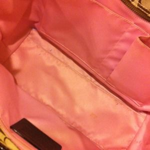 Chocolate brown trim w/tan coach fabric exterior. On outside no rips, holes or stains. On inside there is blue pen mark very little (pic 3) and looks like a little tan stain (probably can come out) prices are firm only cuz these are my very first bags so kinda sentimental. Plz let me know if you have any questions.