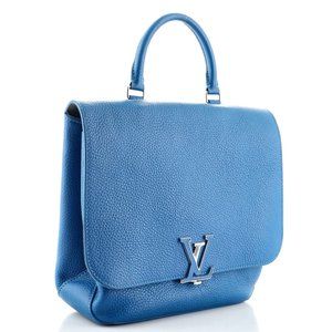 This is an authentic Louis Vuitton Taurillon Volta in Blue. This lovely tote is crafted of soft taurillon pebbled calfskin leather in periwinkle blue. The bag features a rolled leather top handle with silver links, an optional shoulder strap with clasps, and a broad facing flap with a silver Louis Vuitton LV encased with leather. The flap opens to a partitioned matching microfiber interior. Retail $4,300