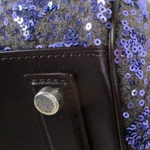 This chic baguette has a striking layering of sequins in purple creating a Louis Vuitton monogram impression. The bag features brown rolled leather top handles with squared silver links, a leather top crest and a wrap-around zipper with a leather pull with a silver press lock fixture. This opens to a brown fabric interior.