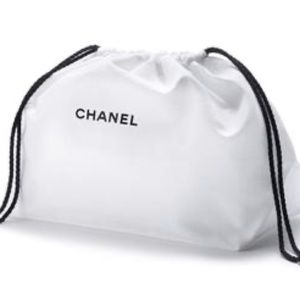 All white with black CHANEL logo and black drawstrings, this bag can be used as a gift bag, storage, dust bag, make up bag, jewelry bag, drawstring hand purse, travel accessory.