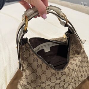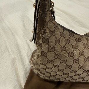 Chic Gucci shoulder bag with iconic monogram pattern and horsebit . There is some wear on the canvas that I included pics of. The handle is genuine leather and in great condition. Definitely has a lot of life left with this popular Y2K style.