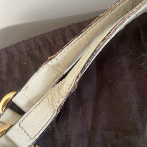 Gucci Soho Cellarius Medium Tote Bag is white calf leather, grained texture. Signature Double G logo, tassel detail, two top handles, clip fastening for main compartment, internal zip-fastening pocket, metal feet, gold-tone hardware. Used but still in good condition, noticeable wear on the corner bottom. straps have a worn area. Inside has a couple of stains but not terrible. Receipt is faded over time. Zoom into see better. Authentication Card. Protective Gucci cover bag included. Purchased 2014