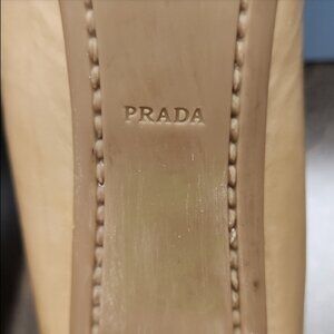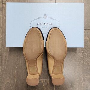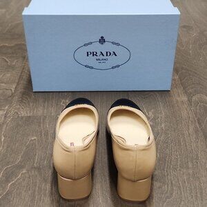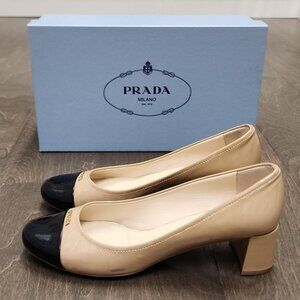100% Authentic!! Prada Logo Black Beige Patent Block Heels Pumps