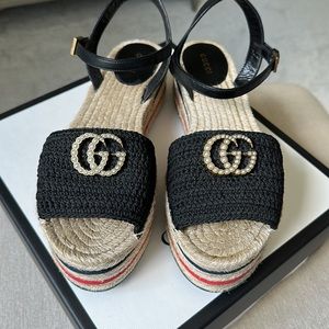 Authentic Women’s Gucci GG Lilibeth Black Platform Sandals, braided raffia and buffed leather sandals, open toe, faux pearl embellished logo detail on strap, adjustable ankle strap, jute footbed, Gucci logo patch on footbed, braided jute midsole in beige with stripes in navy and red. Treadell rubber outsole in navy.
