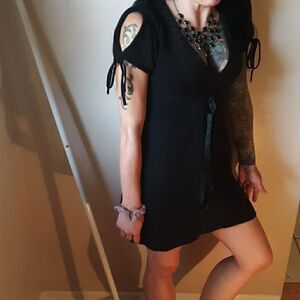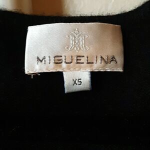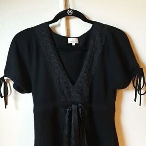 MIGUELINA brand, 100% cashmere, v-neck style,, with lace embroidered detail, fitted adjustable waist with shiny black bow that tie at the empire waist, and end of sleeves. Size XS, but can also fit size small or medium, depending on whether it is worn as a mini dress, or tunic. Can be worn more casual, with leggings or skinny jeans, as a stylish tunic top or dressed up! Approximately 32.5" long from top of shoulder to bottom hem. Professionally Dry clean only.