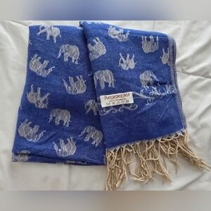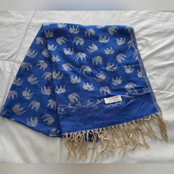 Beautiful blue elephant pattern with fringe ends Cashmere silk scarf Chang Lom pashmina in excellent like new condition. Measures approx 65x27"