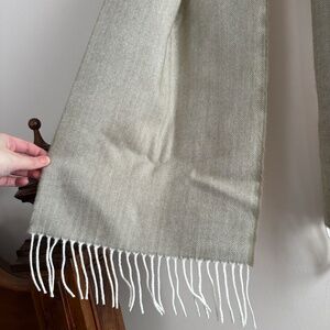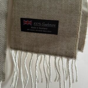 100% cashmere, made in scotland. Beige and white herringbone pattern all over. In like new condition, no flaws!