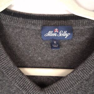 The product is a men's XL gray V-neck cashmere sweater from Allwn Solly. It features a tight-knit fabric in a solid pattern, long sleeves, and a regular fit. This pullover sweater is perfect for casual occasions in the winter and fall seasons, adding warmth and style to any outfit. Made in China, this high-quality sweater showcases the luxury and sophistication of the brand Allen Solly.